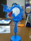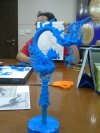 สิ่งที่น่าสนใจคืองานชิ้นนี้แสดงถึงกระบวนการสร้างสรรค์จากแบบร่าง 2 มิติ สู่ต้นแบบ 3 มิติในวัสดุเรซิ่น ซึ่งเป็นขั้นตอนสำคัญในการเปลี่ยนจินตนาการให้กลายเป็นชิ้นงานจริงที่จับต้องได้ สีฟ้าที่ใช้กับต้นแบบเรซิ่นนั้นไม่ได้เป็นเพียงแค่สี แต่ยังช่วยให้มองเห็นรายละเอียดและความโค้งเว้าของงานได้อย่างชัดเจน ก่อนจะนำไปสู่กระบวนการผลิตจริงด้วยวัสดุอื่นๆ ต่อไป
