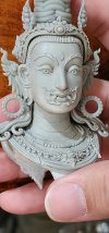 ความคม (Sharpness): แม้จะเป็นงานปั้นขนาดเล็ก (สังเกตได้จากการเทียบกับนิ้วมือ) แต่ร่องลายกนกและเส้นคิ้วมีความคมชัด ไม่มีการเบลอหรือฟุ้งของชิ้นงาน ซึ่งเป็นคุณสมบัติเด่นของสตูดิโอที่เน้นงานคุณภาพระดับพรีเมียม